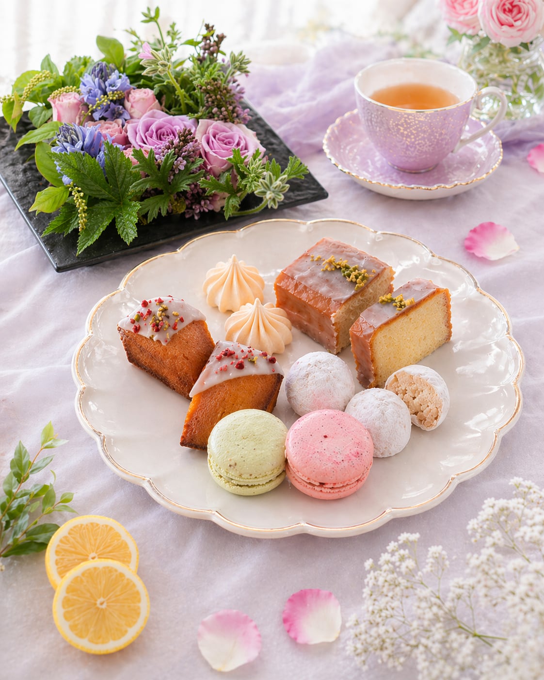 さらに、マカロンと焼き菓子、華やかなフラワーアレンジメントも添えて。